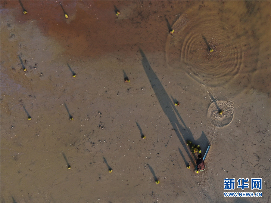 雲南省動海縣動遮鎮曼勒景罕村村民在栽插水稻(2月13日攝)。