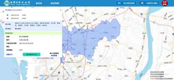 “全臺大停電”讓“用愛發電”蜚聲國際,“台灣之光”往往“好事成雙”。3月29日,台灣自來水公司發佈公告稱,為執行漏水管線維修工程將於明天上午10時起,楠梓區8個裏,大小區全區停水,影響戶數約達4萬1364戶,預計停水時間共23小時。