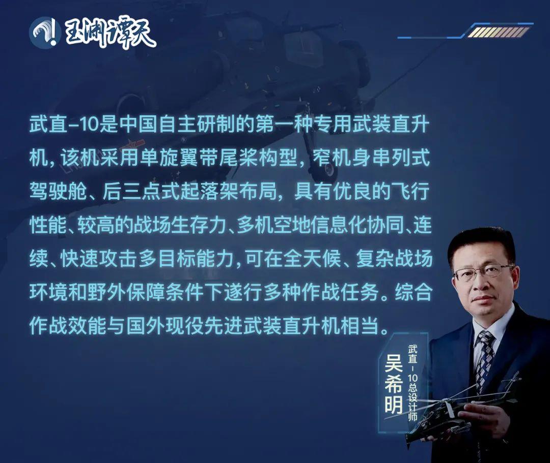 吳希明總設計師也告訴譚主,武直-10解決了解放軍陸軍嚴重缺乏專用武裝直升機的問題。之前,我國的武裝直升機比韓國、日本這些國家還要少,但就在4年前相關報道説,我國陸軍的軍用直升機數量已經達到世界第二。