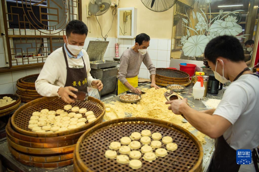 1月18日,澳門“最香餅家”員工在製作手工炭燒杏仁餅。新華社記者 張金加 攝