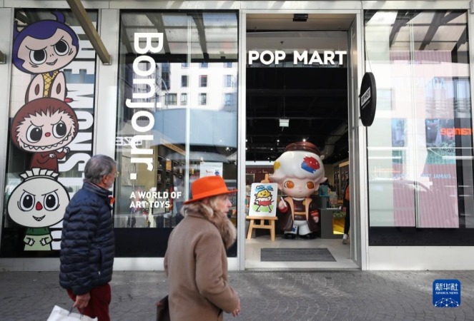 3月1日,人們走過位於法國巴黎市中心的泡泡瑪特門店。新華社記者 高靜 攝