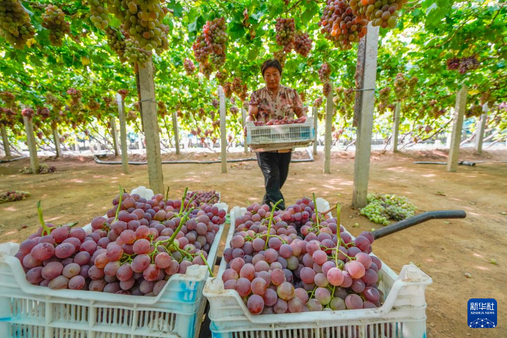 8月12日,河北省秦皇島市盧龍縣蛤泊鎮農民搬運裝箱的葡萄,準備外運。