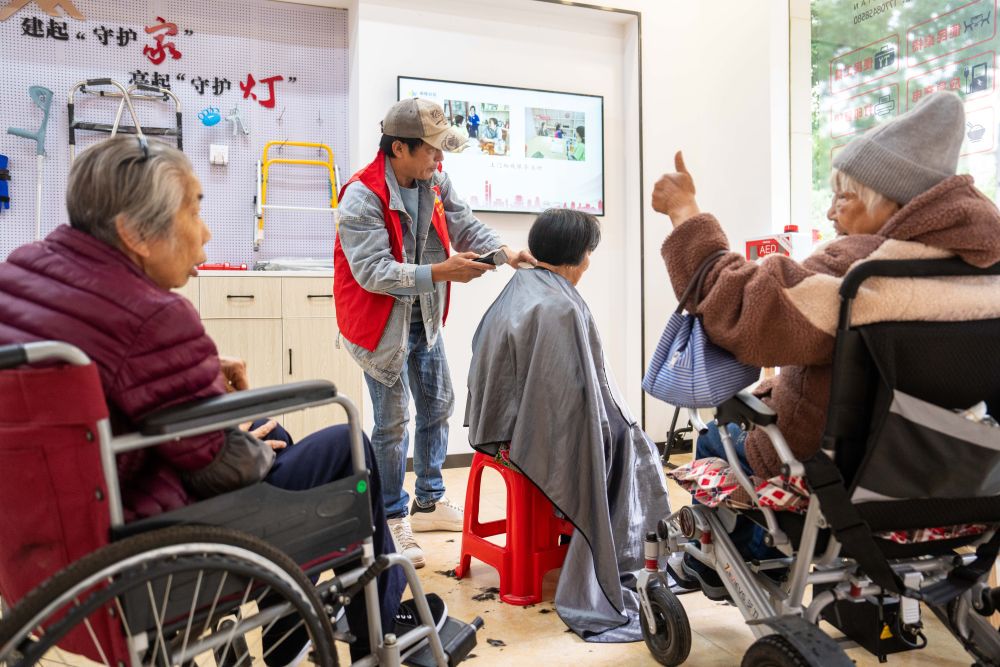 2025年11月6日,在湖南省長沙市望城區高塘嶺街道湘陵社區,志願者為老年人和殘疾人士免費理髮。新華社記者 陳思汗 攝