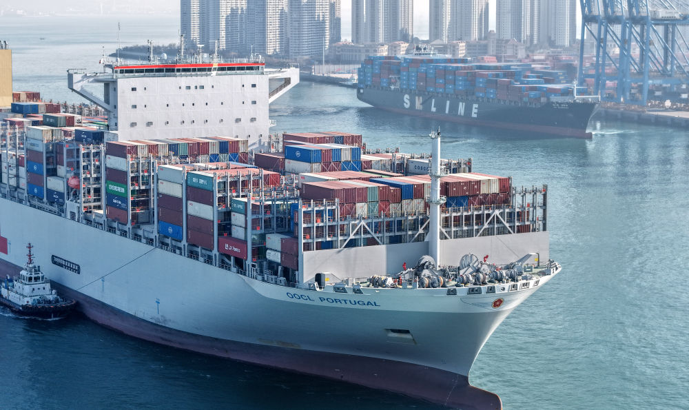 2025年12月4日,貨輪進出山東港口青島港前灣港區(無人機照片)。新華社記者 李紫恒 攝