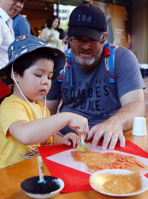 2月1日,在澳大利亞珀斯的西澳大利亞博物館,當地兒童在家長陪同下拓印新年福貼。(周丹 攝)