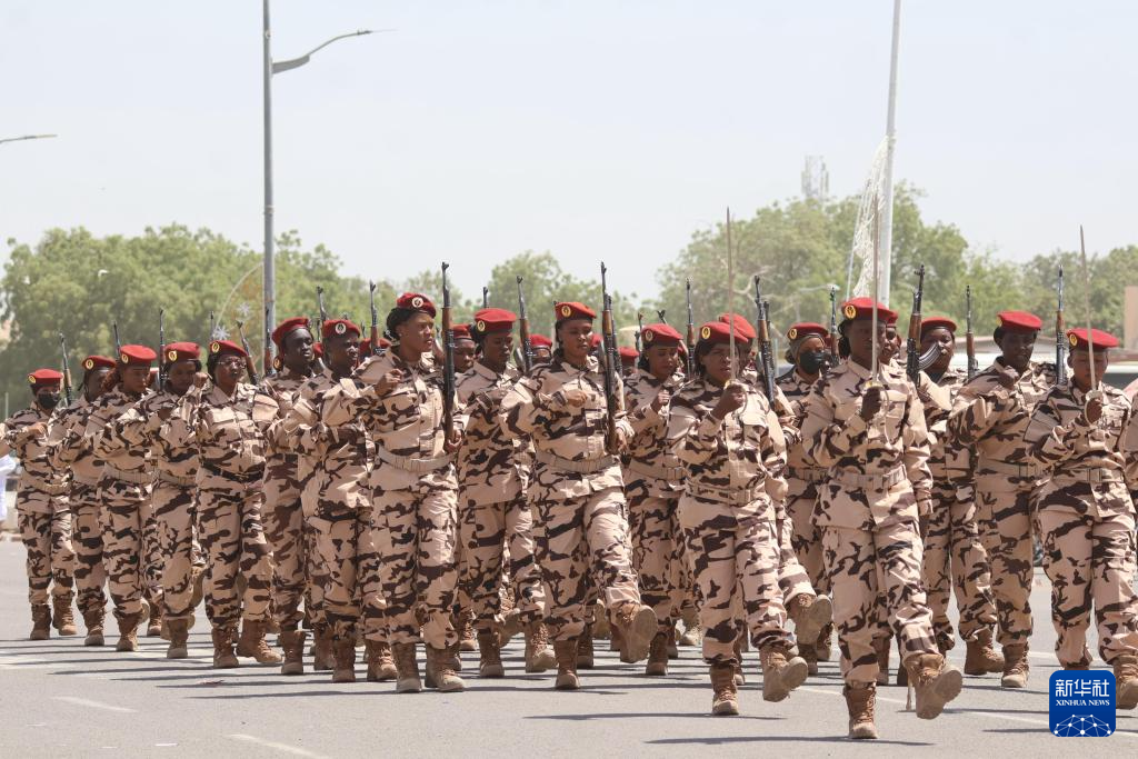 3月8日,在乍得首都恩賈梅納民族廣場,女性士兵參加國際婦女節遊行。新華社發(阿諾攝)