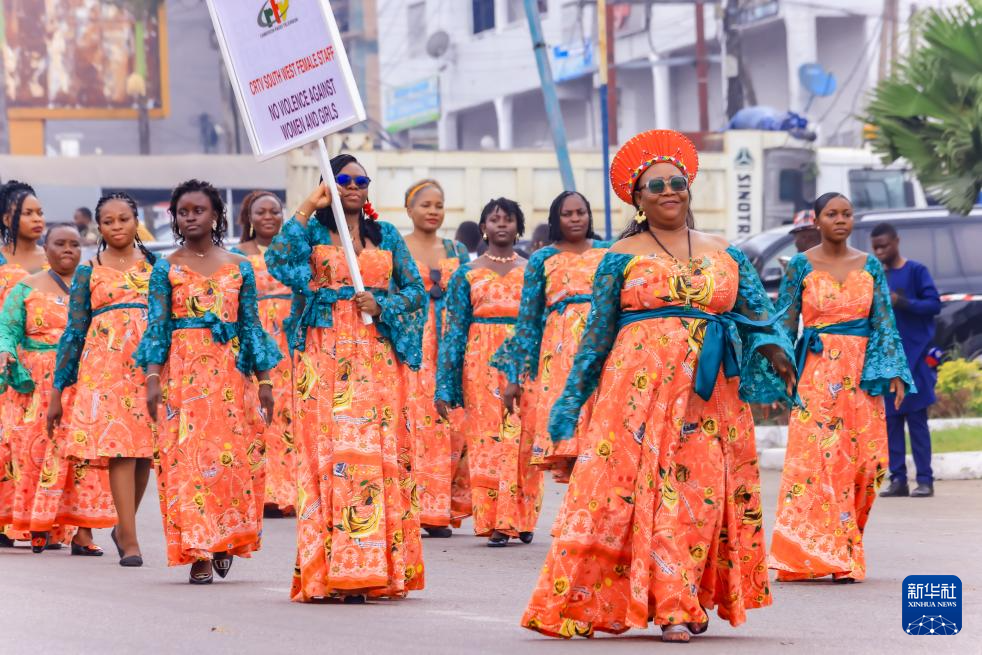 3月8日,在喀麥隆西南大區首府布埃亞,婦女身著特色服飾參加國際婦女節遊行。新華社發(穆朗·廷古姆攝)