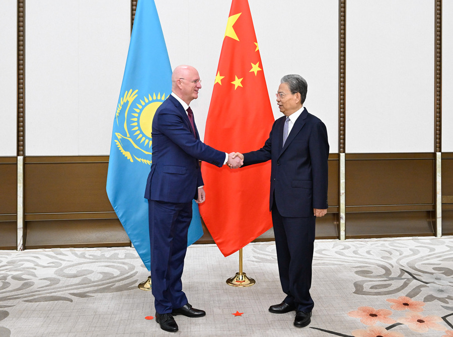 3月25日上午,全國人大常委會委員長趙樂際在海南博鰲會見來華出席博鰲亞洲論壇2026年年會的哈薩克斯坦第一副總理斯克利亞爾。新華社記者 申宏 攝