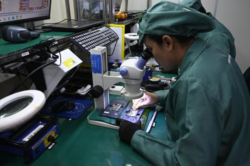 2025年5月21日,在OPPO位於巴西馬瑙斯的手機主板製造工廠車間,工人對主板進行檢測。新華社記者周永穗攝
