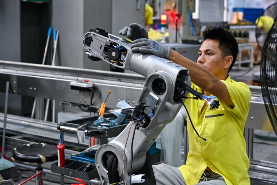 2025年7月3日,在位於安徽省蕪湖市的埃夫特智慧機器人股份有限公司內,工作人員在裝配機器人。新華社記者張鋮攝