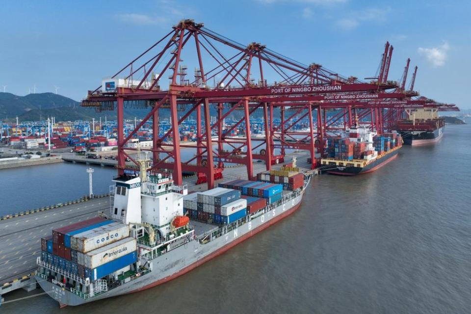2025年10月13日,在寧波舟山港金塘港區大浦口集裝箱碼頭,船舶進行集裝箱裝卸作業(無人機照片)。新華社發(鄒訓永攝)