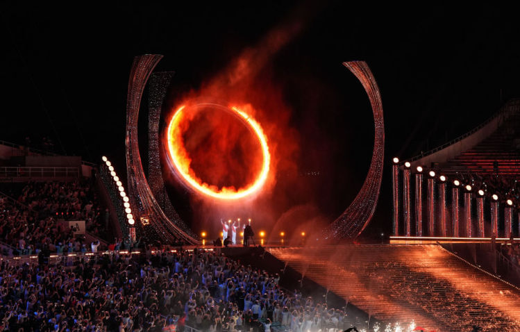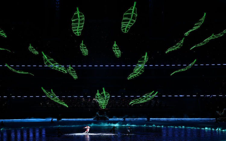 節奏忽轉明快,足球、籃球、排球、騎行等體育元素躍然臺上。歌曲《龍騰伶仃洋》將氣氛推向高潮。奔跑的飛人與躍動的鐳射競速,水上健兒在波濤中衝刺,展現科技與體育的融合。